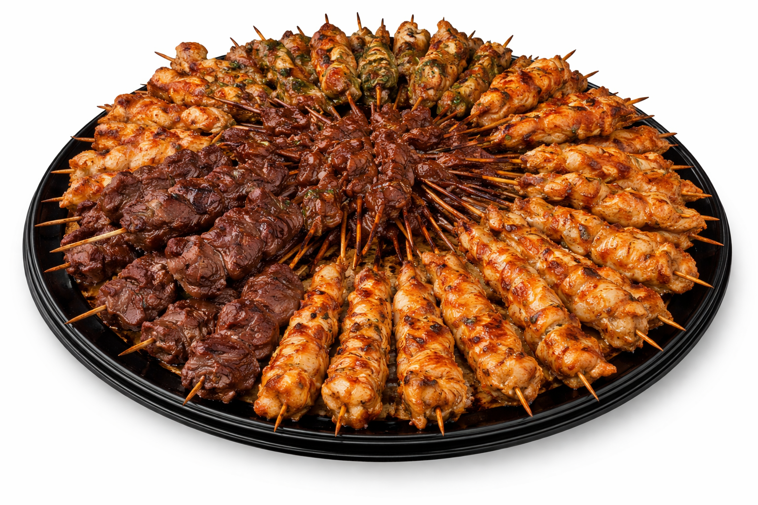 Our famous mixed grill platters are perfect for your next lunch or dinner party. Choose from chicken shish kebab (white or dark meat), kufta beef kebab, marinated basil chicken (dark meat), duck sauce chicken (white or dark meat), Philly steak on a skewer, sliced chicken steak (white or dark meat) in your choice of mayo basil, honey mustard or BBQ sauce.